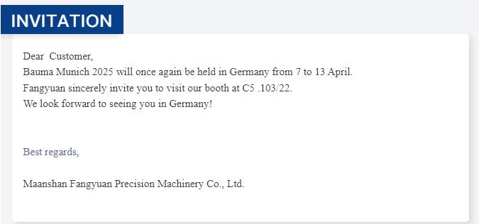 2025年4月7-13日,工程機械領域的國際頂級盛會,第34屆德國慕尼黑BAUMA展,將在慕尼黑新國際博覽中心震撼啟幕。德國慕尼黑工程機械展-寶馬展(BAUMA)是全球規(guī)模最大、最具影響力的國際工程機械、建材機械、礦山機械行業(yè)專業(yè)展覽會。是了解和評價工程機械行業(yè)發(fā)展相關技術進步的重要標尺,為規(guī)劃開拓國際市場的工礦機械企業(yè)搭建了良好的平臺。 方圓精密誠摯邀請您蒞臨我們的展位,期待與您面對面交流,探討合作機會。您的光臨將是我們莫大的榮幸!