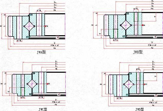 注:無齒式(JU)系列外形尺寸由相同滾道中心直徑的內(nèi)齒式D和外齒式dn組成,其堵塞與油孔布置在外圈上。