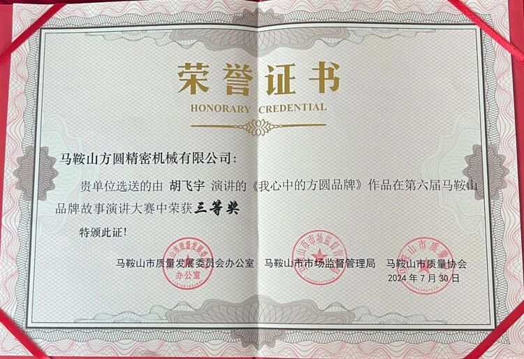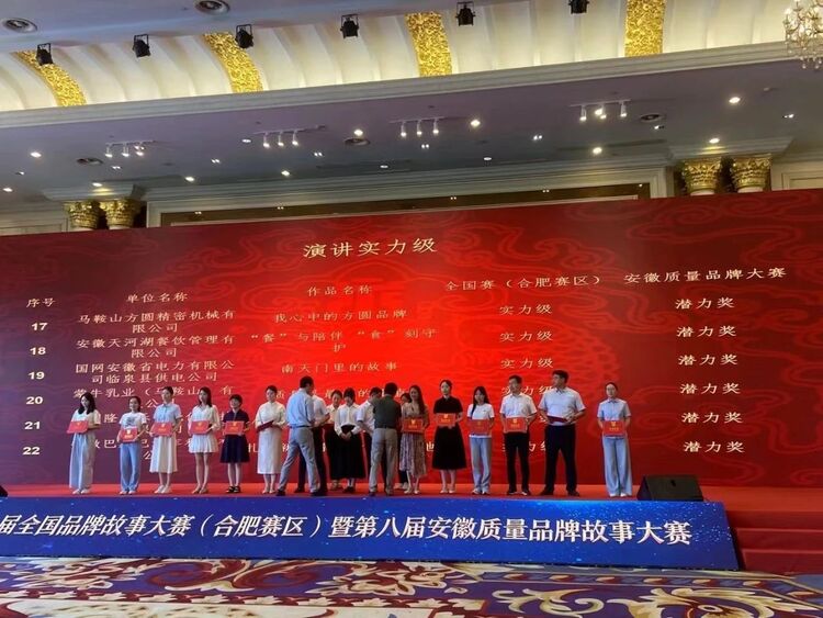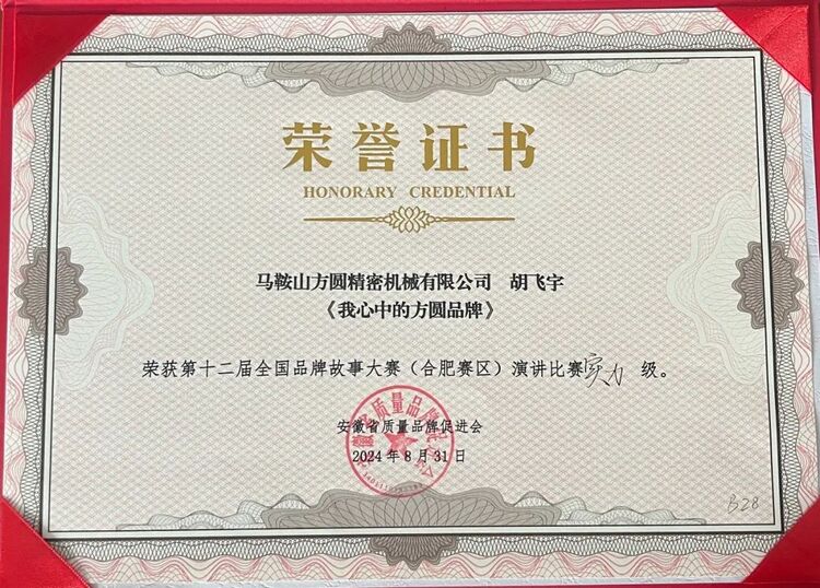 公司設(shè)計(jì)部產(chǎn)品工程師胡飛宇同志演講的品牌故事作品《我心中的方圓品牌》,在省、市質(zhì)量品牌大賽中分別榮獲第六屆馬鞍山品牌故事演講大賽三等獎(jiǎng)、第八屆安徽質(zhì)量品牌故事大賽演講比賽潛力獎(jiǎng)、第十二屆全國(guó)品牌故事大賽(合肥賽區(qū))演講比賽實(shí)力級(jí)。